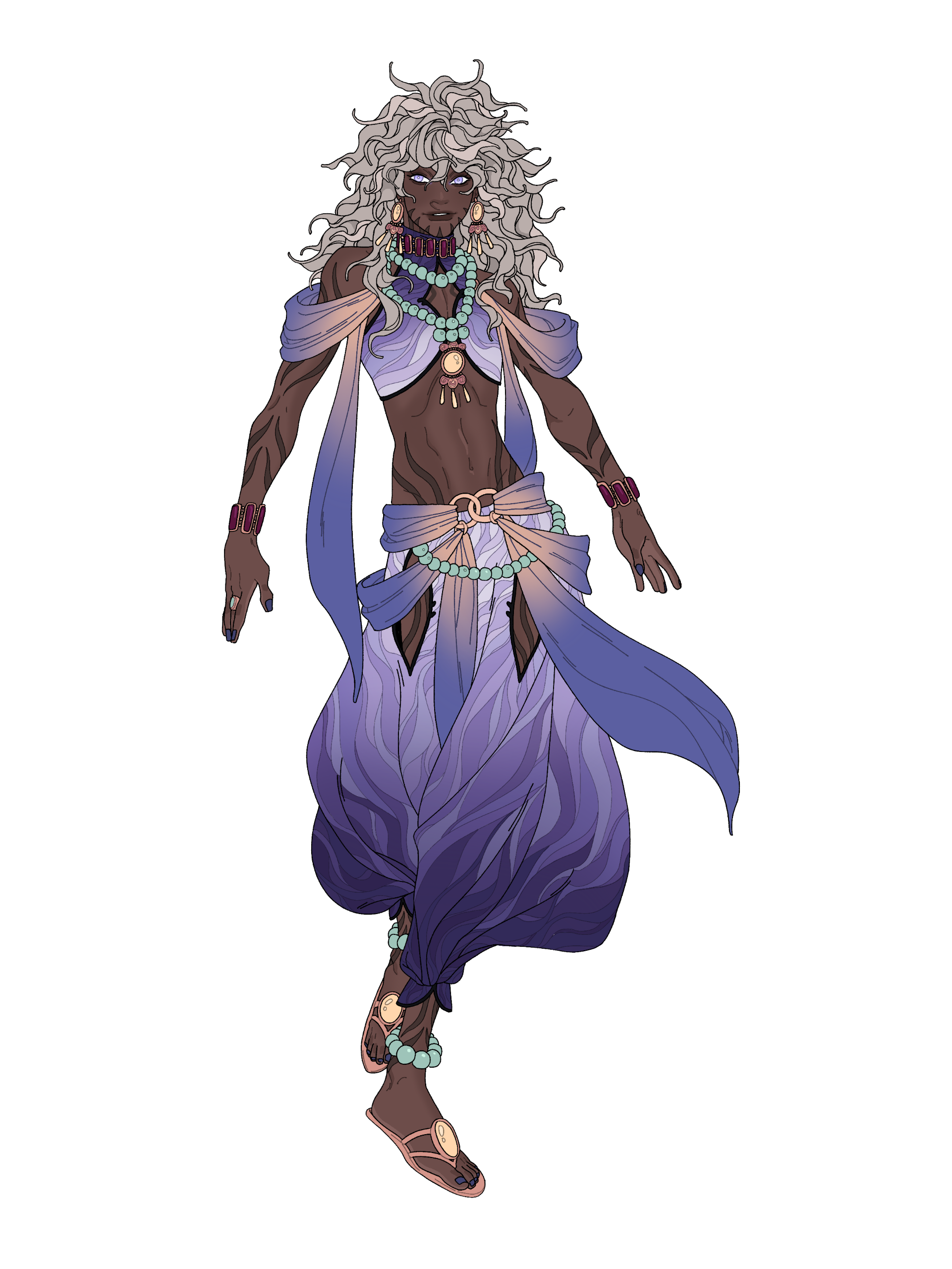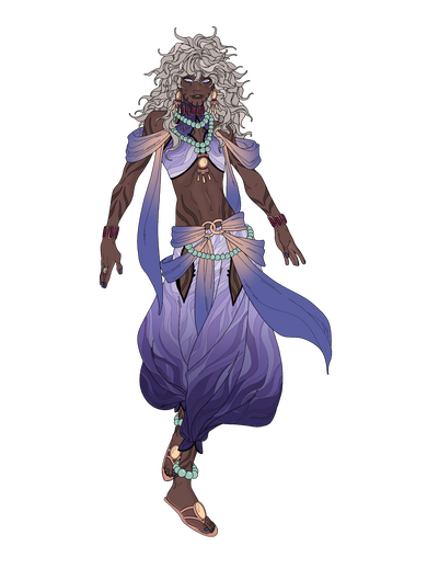 BODY : dark tan skin. tall body, slender & lithe figure + muscles. elongated limbs. glowing eyes and hair. illusionary aesthetics.